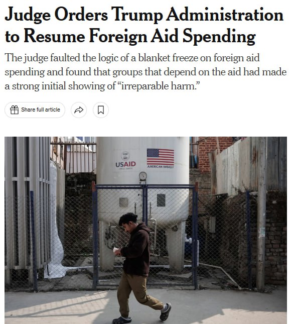 Суд обязал Трампа возобновить иностранную помощь, сообщает The New York Times.