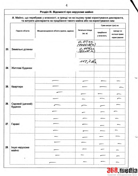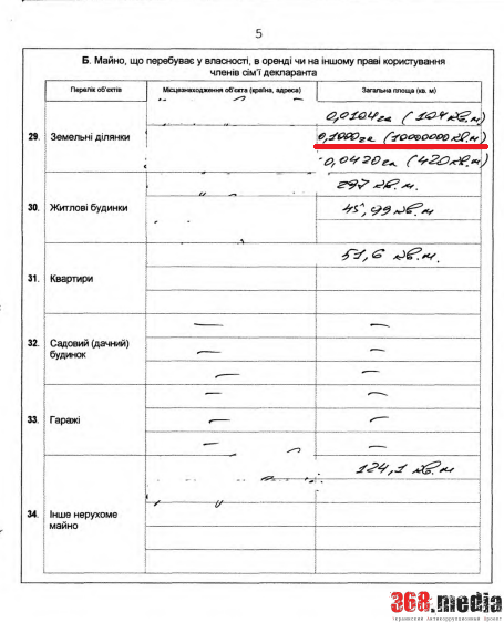 Жена Посторонко оказалась зажиточней супругу. Она владеет тремя земельными участками – 0,1, 0,04 и 0,01 гектара. Примечательно, что чиновник в декларации ошибся с цифрами, переводя квадратные метры в гектары. Вероятно, математика и работа в налоговой службе несовместимы.