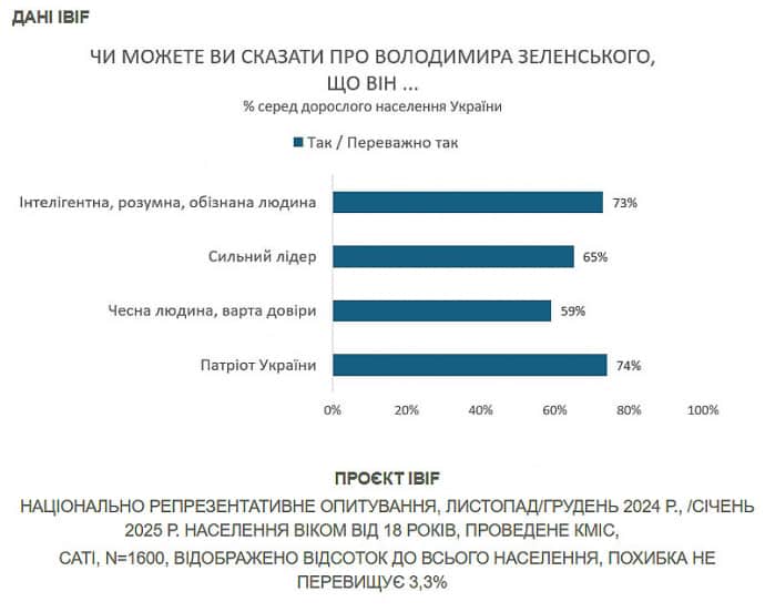 74% опрошенных считают его патриотом Украины, 73% убеждены, что он умный и осведомленный человек, 60% считают его честным и достойным доверия, а 65% считают его сильным лидером.
