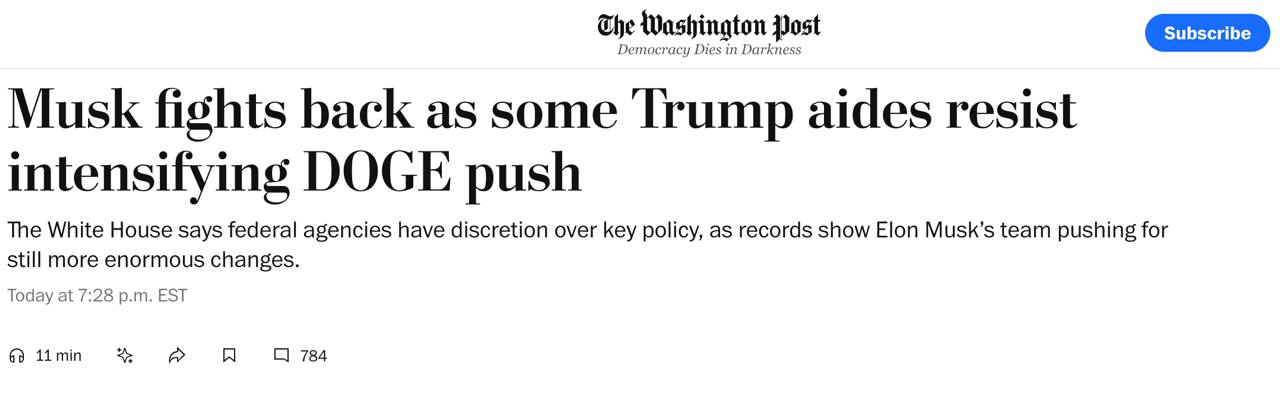 Издание считает, что усиливается "внутреннее недовольство" чиновников действиями DOGE и Маска.