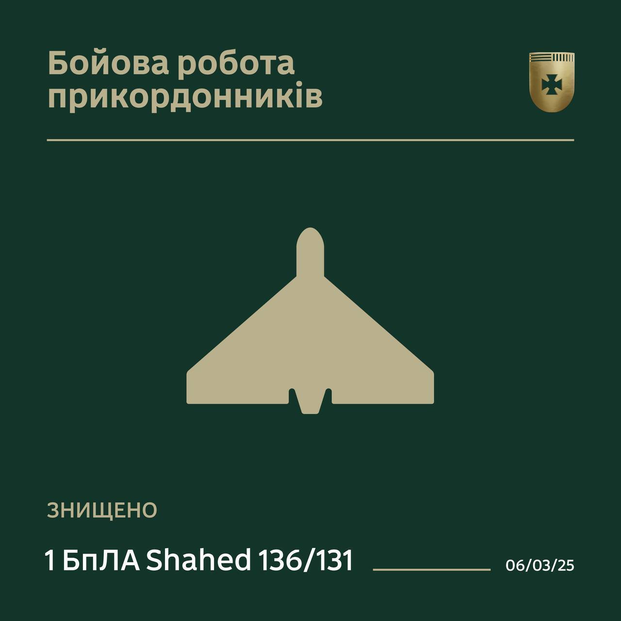 "Есть сбитие! Пограничники очистили небо Сумской области от вражеского беспилотника типа "Герань-2". Барражирующий боеприпас потерял высоту, упал и взорвался", – говорится в сообщении.