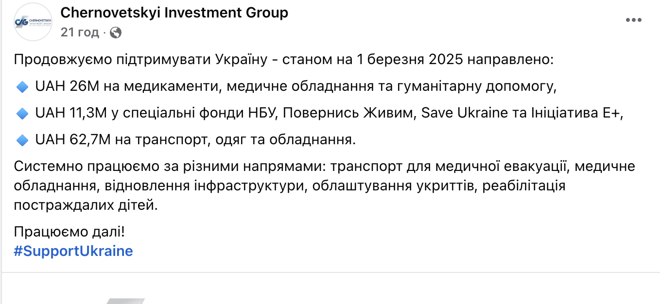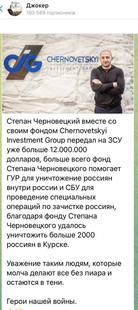 На телеграм-каналах распространяли еще одно недостоверное утверждение, что Стёпа вместе со своим фондом Chernovetskyi Investment Group передал на ВСУ уже более 12 млн долларов и сделал это без пиара. Однако пиар есть. На официальной странице в Fb указано, что фонд передал пожертвования только на 100 млн гривен, что в ПЯТЬ раз меньше!
