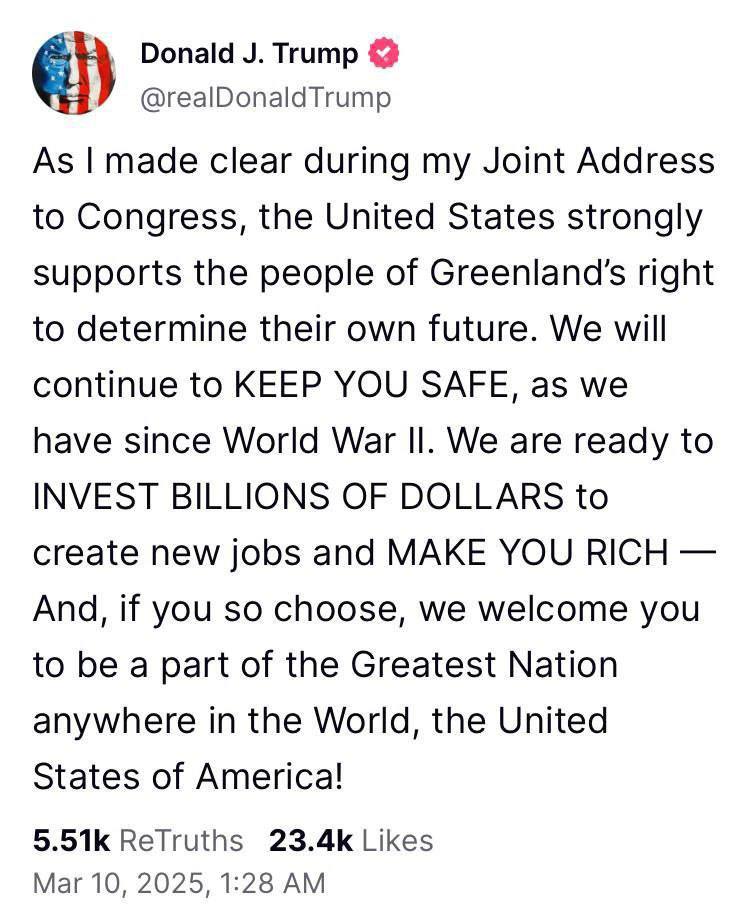 "Мы будем продолжать заботиться о вашей безопасности, как мы делали это со времён Второй мировой войны. Мы готовы вложить миллиарды долларов, создать новые рабочие места и сделать вас состоятельными. Если вы захотите, вы можете стать частью самой замечательной страны в мире, Соединённых Штатов", - написал Трамп в Truth Social.