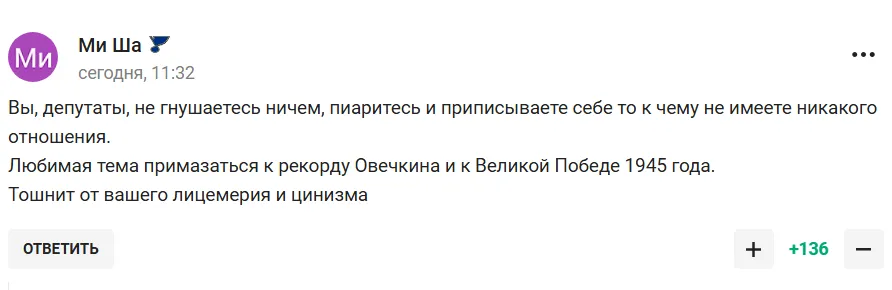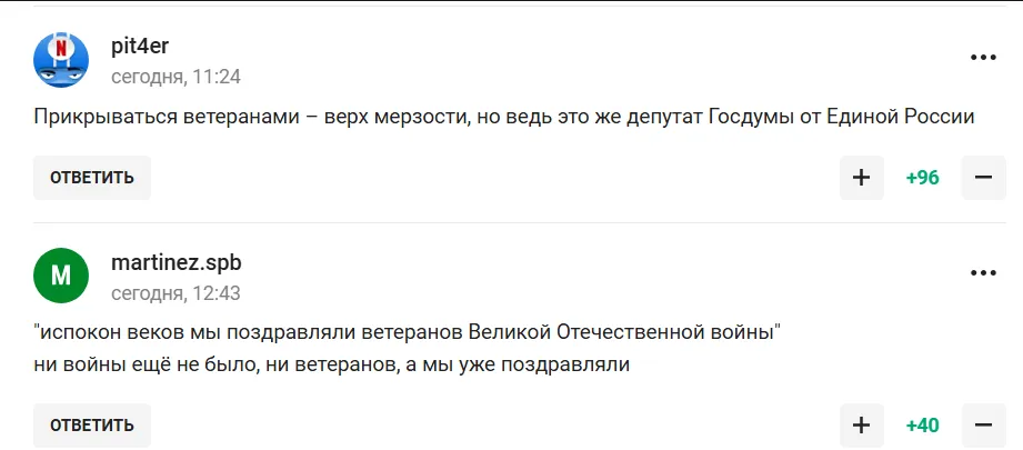 Сторонники РФ выразили свое недовольство действиями депутата, подчеркивая, что они часто пиарятся на темах, к которым не имеют отношения, и приписывают себе заслуги в исторических событиях, таких как Победа в Великой Отечественной войне. Один из пользователей отметил, что такие действия депутатов напоминают лицемерие и цинизм. Другие в своих комментариях указали, что использование ветеранов Великой Отечественной войны для политических целей — это верх мерзости.