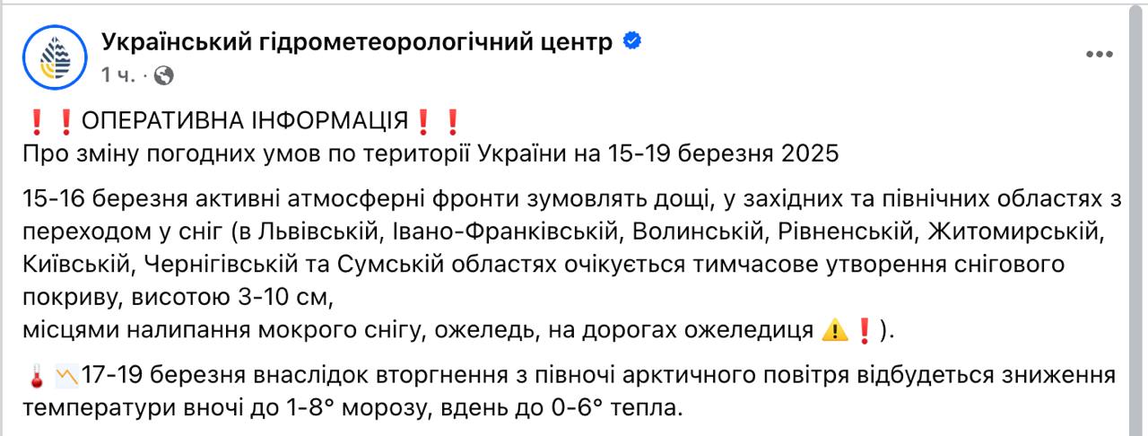 Снег ожидается в Киевской, Львовской, Ивано-Франковской, Волынской, Ровенской, Житомирской, Черниговской и Сумской областях.