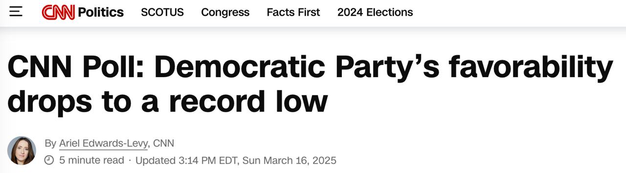 Согласно проведенному ими опросу, рейтинг поддержки Демократической партии в настоящее время составляет всего 29% — это самый низкий уровень, зафиксированный в опросах CNN с 1992 года. Этот показатель на 20% ниже, чем в январе 2021 года, когда Трамп завершил свой первый срок.