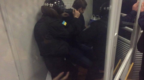 Активісти не давали конвою забрати підозрюваного Андрія Медведька із залу суду. Вони вимагали, щоб до суду приїхав генеральний прокурор Віктор Шокін або його представник.