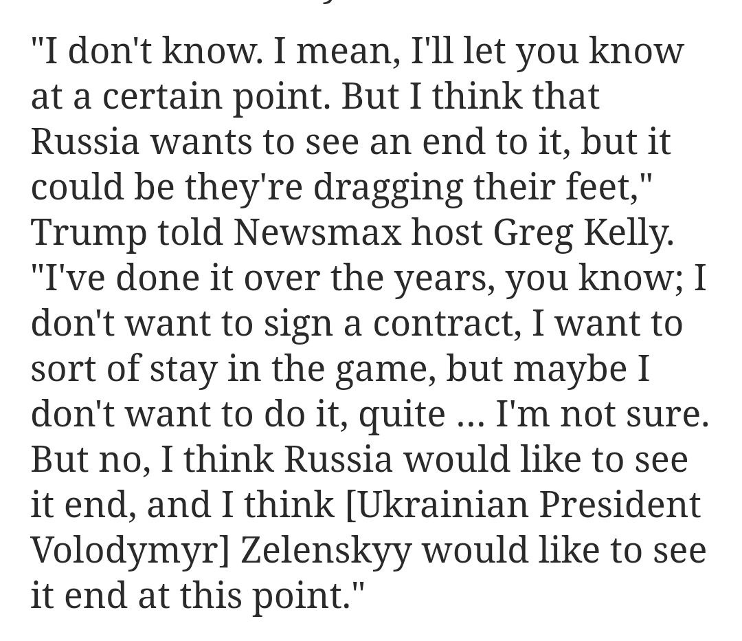"Считаю, что Россия хочет завершить это, хотя, возможно, они и затягивают время. Я поступал так долгие годы, знаете; я не тороплюсь подписывать контракт, предпочитаю оставаться в процессе, но, возможно, я не хочу этого делать… Я не уверен. Однако, думаю, Россия желала бы завершить это, и, думаю, сейчас они также этого хотят", - сказал Трамп в интервью телеканалу Newsmax.