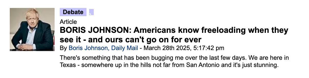 Экс-премьер Великобритании Борис Джонсон в своей колонке для Daily Mail предложил Европе снизить социальные гарантии и расходы на социальное обеспечение, чтобы перенаправить средства на военные нужды. Джонсон отметил, что в США, где расходы на армию намного выше, социальная поддержка граждан значительно скромнее, чем в Европе.