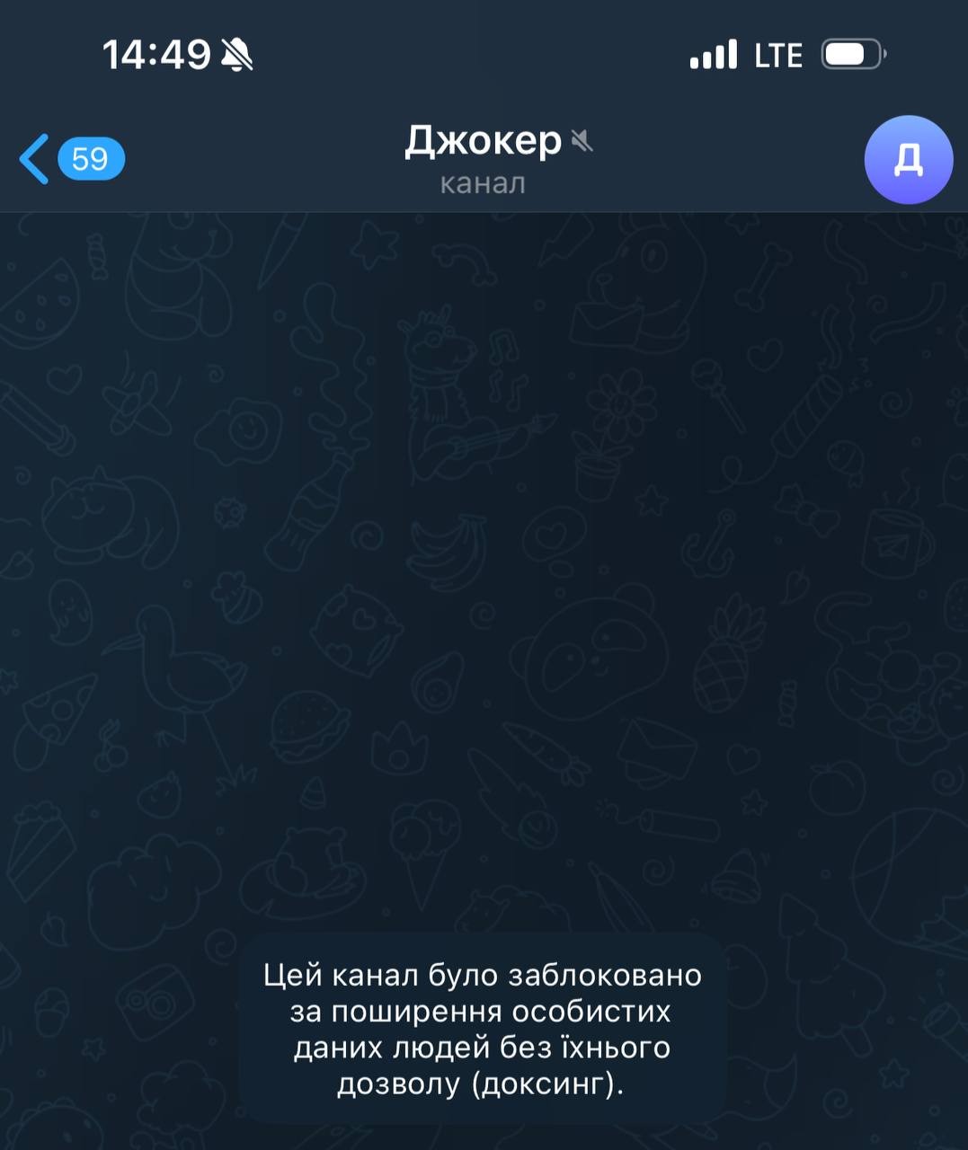 Сегодня в аккаунте Telegram-канала «Джокер» появилось сообщение, что он заблокирован за распространение личных данных людей без их разрешения.