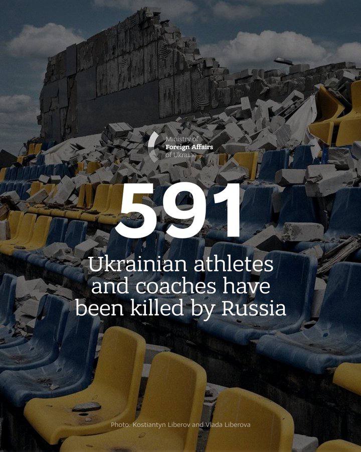 По состоянию на март 2025 года 591 украинский спортсмен и тренер убит Россией, 22 находятся в плену, 11 считаются пропавшими без вести.