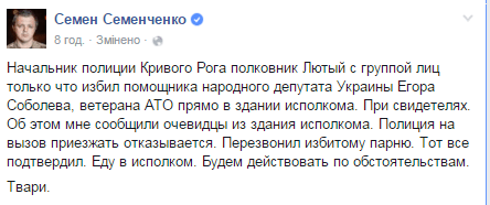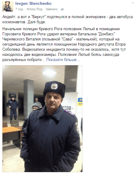 Начальник Криворожской полиции Валерий Лютый схватил за горло и ударил головой об стену помощника народного депутата от "Самопомочі" Егора Соболева, бывшего бойца батальона "Донбасс" Виталия Чернявского.