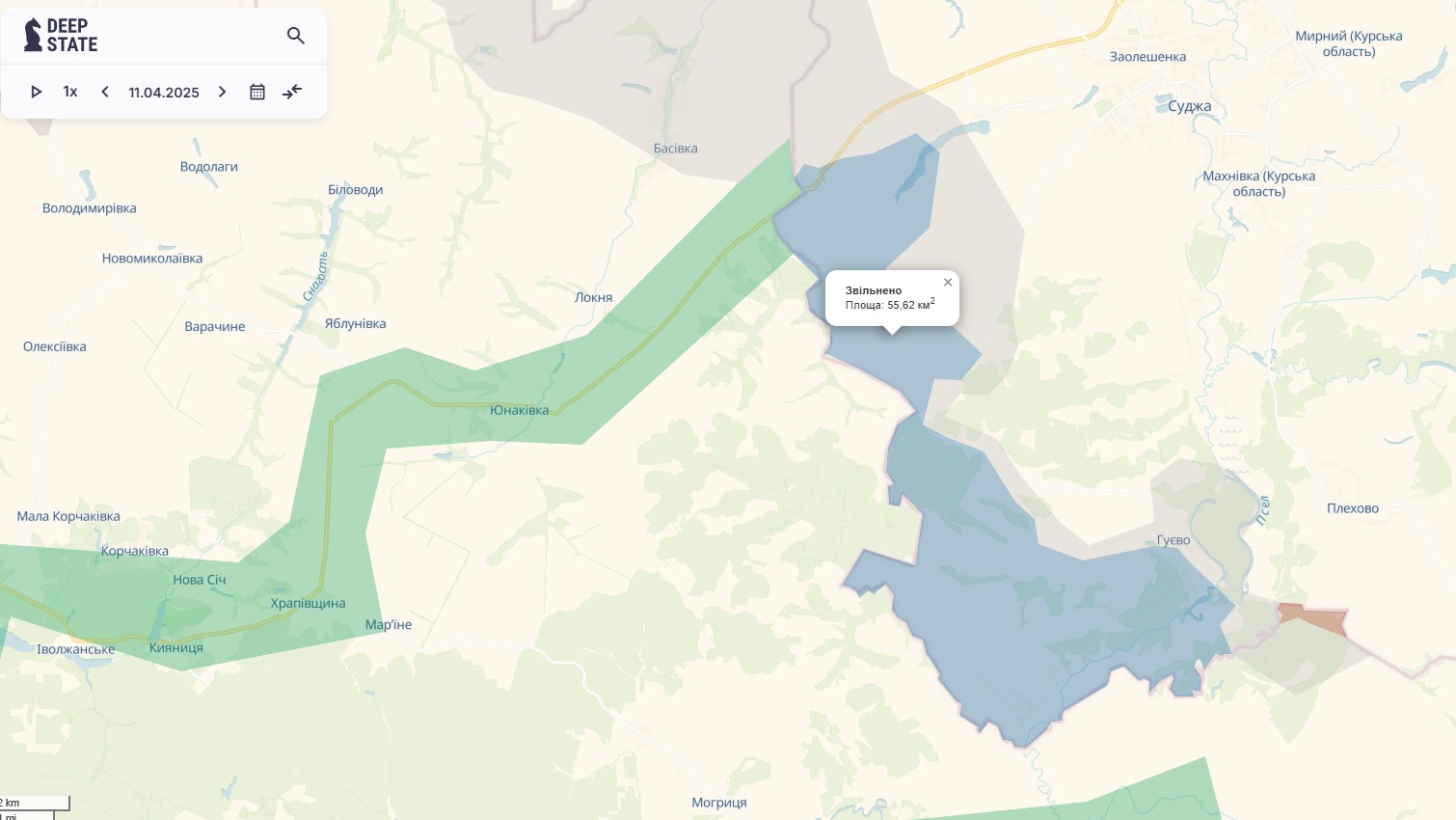 Вечером 12 апреля аналитики сообщили о продвижении ВС РФ в Курской области. На карте указано, что к этой дате украинский плацдарм имел площадь 55,62 кв. км и простирался сплошной линией от дороги на Суджу до села Горналь и реки Псёл. Теперь, как показал DeepState, российские войска продвинулись в полях между селами Олешня и Гуево и достигли границы с Сумской областью. Примерная площадь украинского плацдарма уменьшилась более чем на 30%: северная часть имеет площадь 10,74 кв. км, южная — 26,25 кв. км, как указывает обновленная карта.