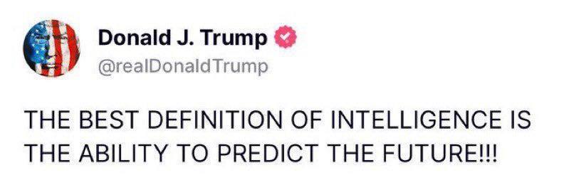 47-й президент США Дональд Трамп сделал новое заявление в своей социальной сети Х, отметив, что «лучшее определение интеллекта — это способность предвидеть будущее».