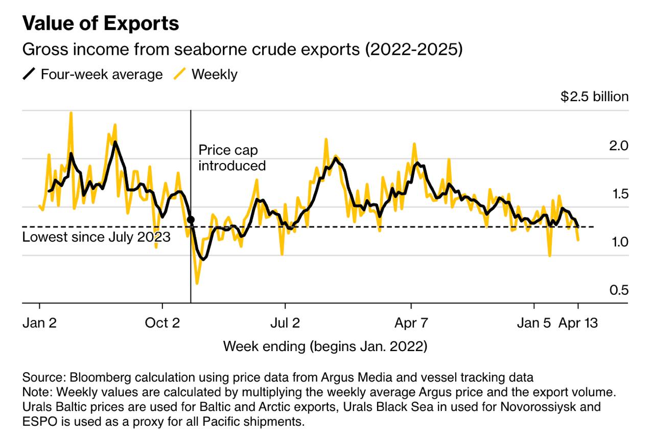 По данным Bloomberg, доходы России от экспорта нефти достигли самого низкого уровня с июля 2023 года.