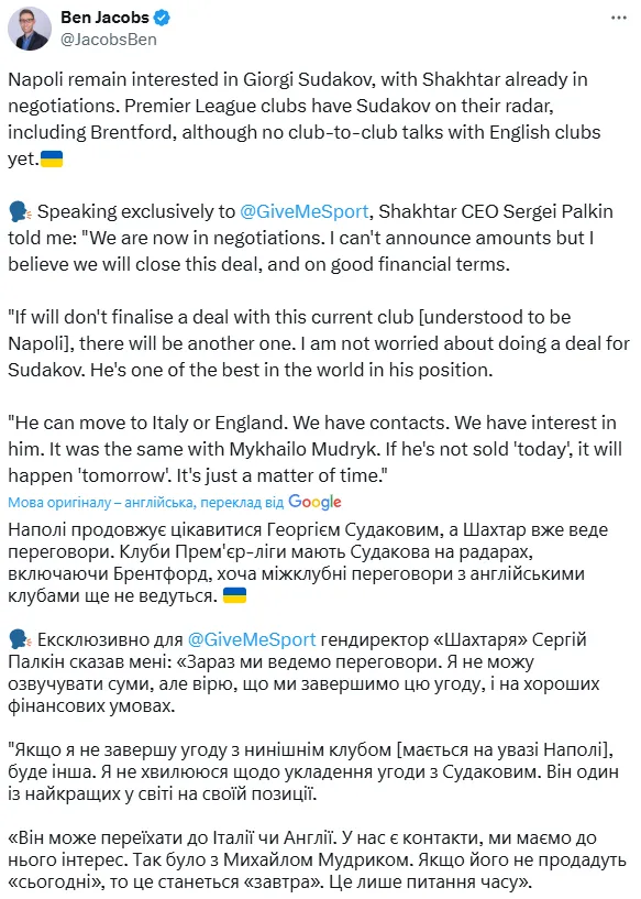 "Сейчас мы ведем переговоры. Я не могу озвучивать суммы, но верю, что мы завершим эту сделку и сделаем это на хороших финансовых условиях. Если мы не достигнем соглашения по текущим переговорам с "Наполи", будет другая. Я не волнуюсь о трансфере Судакова. Он один из лучших в мире на своей позиции. Если мы не продадим его сегодня, то сделаем это завтра. Это лишь вопрос времени", – раскрыл детали Палкин.