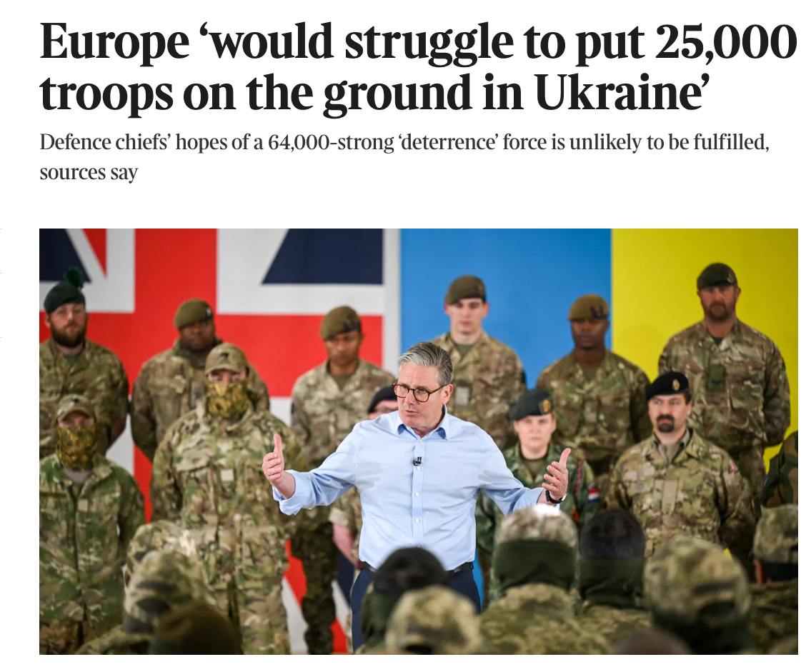 Европа точно не сможет разместить в Украине контингент из 64 тысяч военных, как предполагалось ранее. Кроме того, ей «будет сложно разместить 25 000 военнослужащих в Украине», хотя эта цифра может обсуждаться, сообщает газета Times.