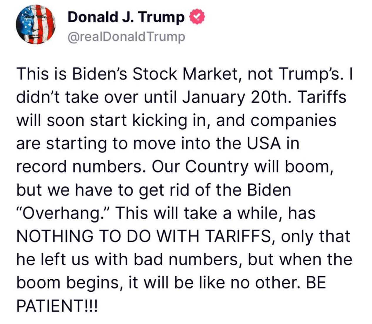 «Это фондовый рынок Байдена, а не Трампа. Тарифы вскоре вступят в силу, и компании начинают массово возвращаться в США. Нашу страну ждёт бум, но сначала нам нужно избавиться от груза, оставленного Байденом», — заявил Трамп.