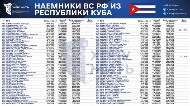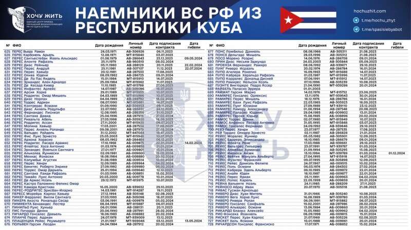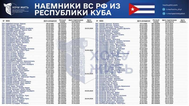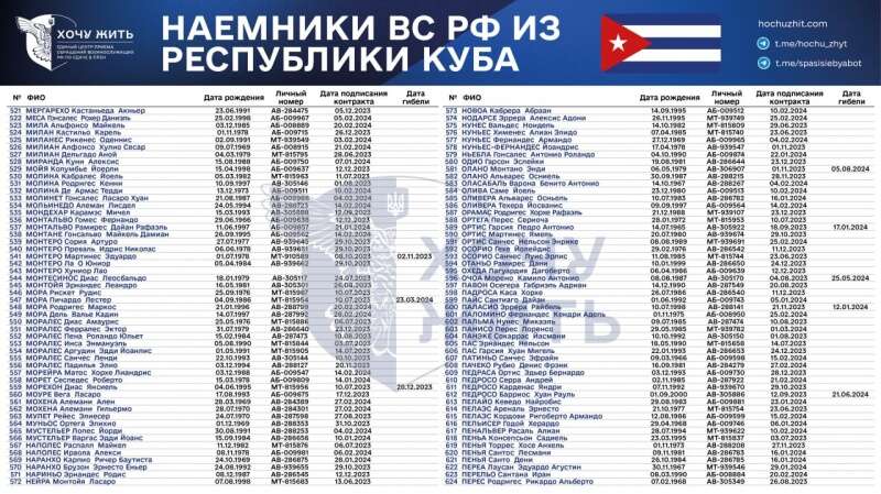 "Нам достоверно известны имена и личные данные 1028 кубинцев, которые подписали контракт с Вооружёнными силами РФ в 2023-2024 годах", - отмечается в сообщении.