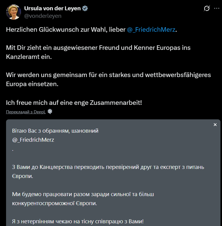 Президент Еврокомиссии Урсула фон дер Ляйен также отреагировала на это событие и поздравила Мерца с избранием на пост канцлера.