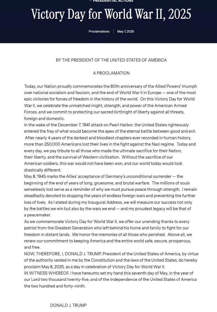 Вчера Трамп, как и обещал, объявил 8 мая Днем Победы во Второй мировой войне.