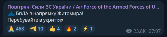 После 7:00 часть дронов из Киевской области переместилась на Житомирщину. Воздушные силы ВСУ предупредили об опасности, в частности, для областного центра. Мониторинговые каналы уточнили, что БпЛА летят на город с юго-западного направления.