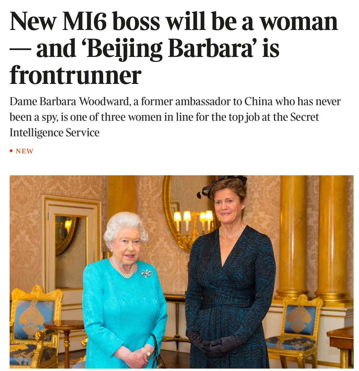 Его позицию может впервые в истории британской разведки занять женщина, сообщает The Sunday Times. Основной претенденткой является бывший посол Великобритании в Китае Барбара Вудворд. Еще два кандидата - женщины-офицеры МИ-6, имена которых остаются в тайне.