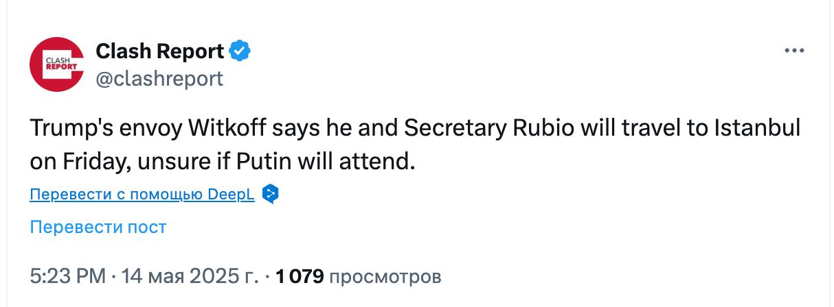 По сообщениям СМИ, Уиткофф и Рубио отправятся в Стамбул не завтра, а в пятницу, 16 мая.