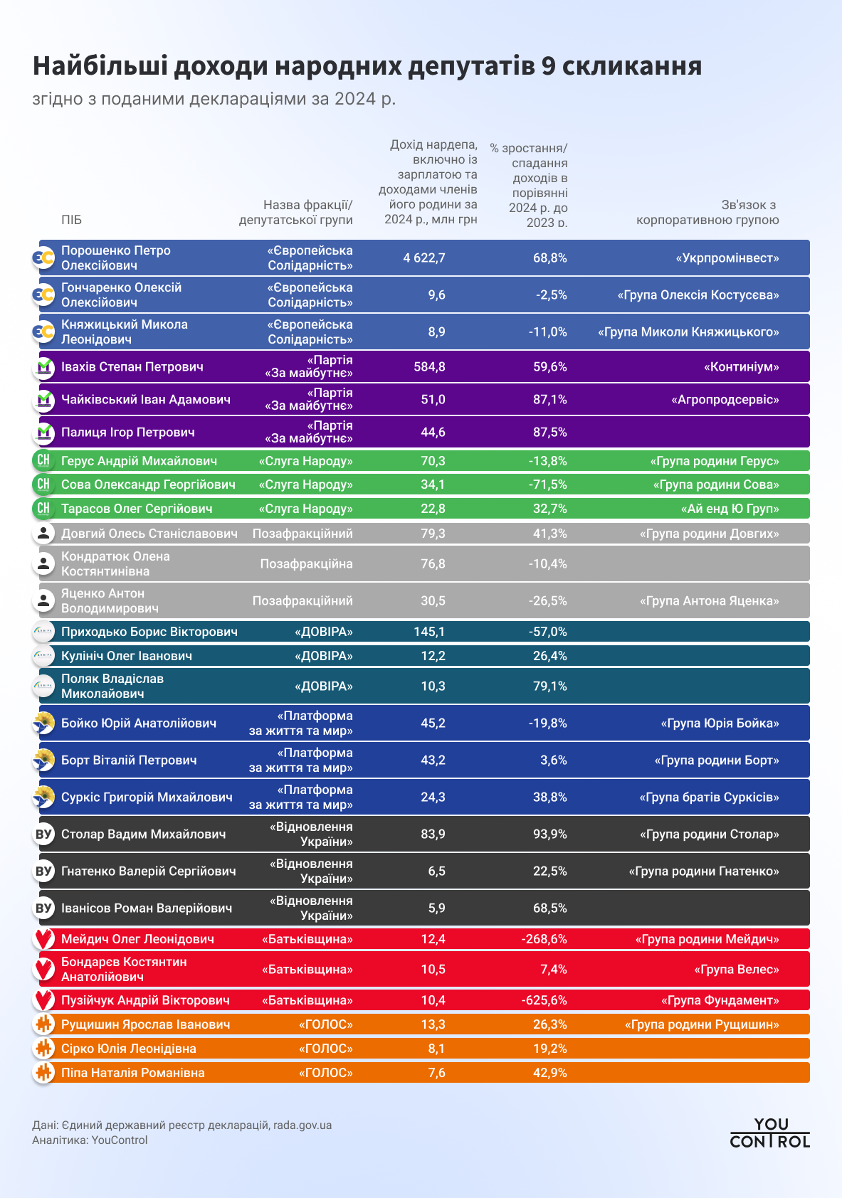 Аналитики R&D-центра YouControl проанализировали декларации народных депутатов за 2023–2024 годы. И определили, кто из народных избранников 9 созыва имеет наибольший доход, учитывая весь перечень фракций и депутатских групп. Также подсчитали процент роста и снижения доходов депутатов по сравнению с предыдущим периодом. А еще определили их связи с корпоративными группами.