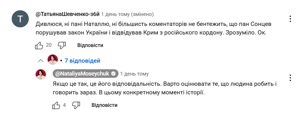 Не остался без внимания пользователей тот факт, что Рустам Солнцев незаконно пересекал украинскую границу и ездил в Крым после 2014 года. Один из пользователей Сети написал: "Смотрю, что ни госпожу Наталья, ни большинство комментаторов не смущает, что господин Солнцев нарушал закон Украины и посещал Крым с российской границы. Понятно. Ок". На это ответила и сама журналистка: "Если это так, это его ответственность. Стоит оценивать то, что человек делает и говорит сейчас. В этом конкретном моменте истории".