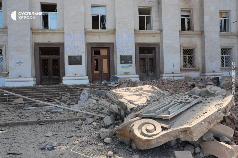 "Суспільне" показало, как выглядит здание ОВА после утреннего удара управляемыми авиабомбами в центре Херсона.
