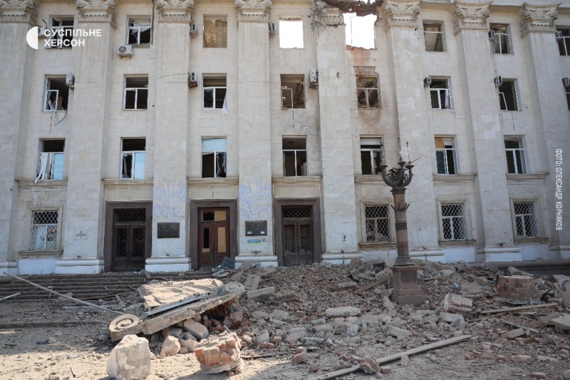 На распространенных фотографиях видно последствия мощного удара по Херсону - вражеская управляемая авиабомба (УАБ) нанесла серьезные повреждения зданию областной администрации. Центральная часть крыши полностью разрушена, частично обрушился фасад, выбиты окна, и заметны значительные повреждения стен.