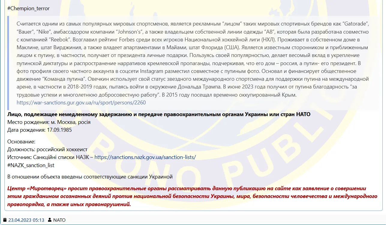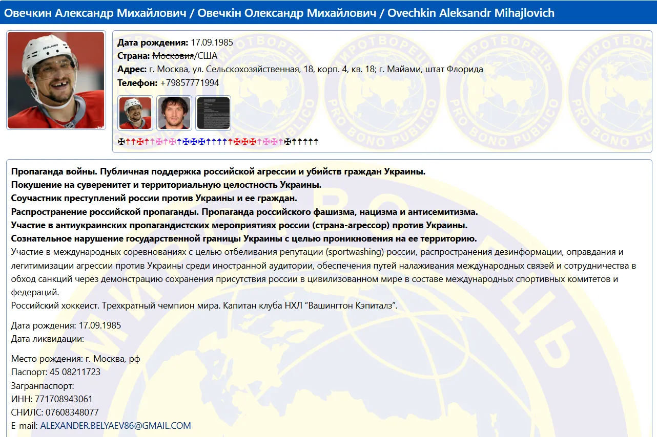 Наиболее результативный бомбардир в истории регулярных чемпионатов Национальной хоккейной лиги (НХЛ) Александр Овечкин был включен в список сайта "Миротворец". Это произошло еще в апреле 2023 года, однако вызвало в России настоящий переполох только сейчас, и информация достигла даже Кремля.