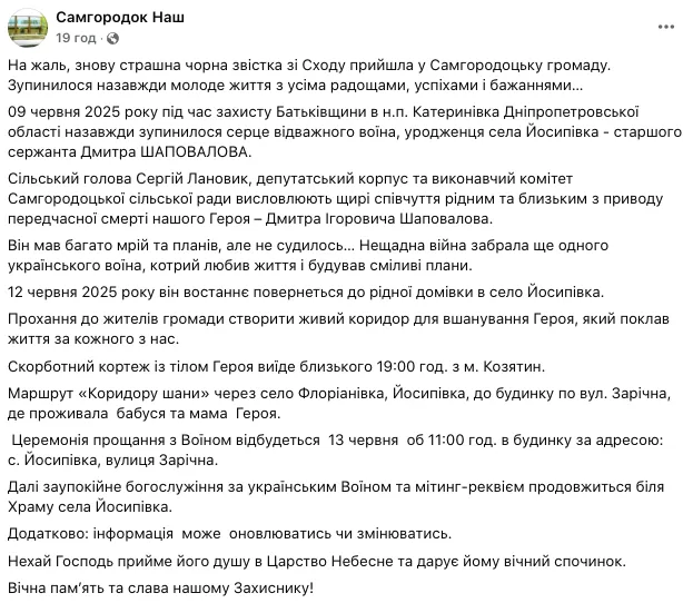 "12 июня 2025 года он в последний раз вернется в родной дом в село Иосифовка. Просьба к жителям общины создать живой коридор для почтения Героя, который отдал жизнь за каждого из нас. Скорбный кортеж с телом Героя выедет около 19:00 ч. из г. Казатин. Маршрут Коридора чести через село Флориановка, Иосифовка, до дома по ул. Заречная, где проживала бабушка и мама Героя", — отметили представители Самгородоцкой общины.