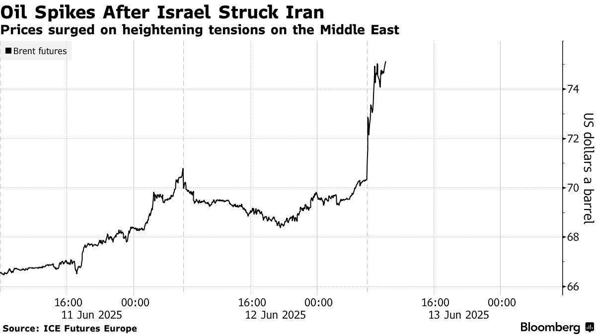 Цены на нефть резко выросли, увеличившись почти на 9% после ночной атаки Израиля на Иран.
