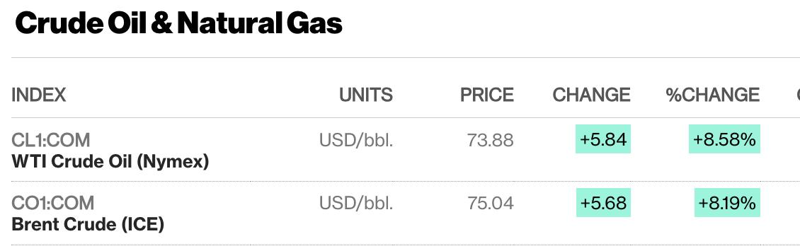 Согласно графикам Bloomberg, стоимость барреля марки Brent превысила отметку 75 долларов.