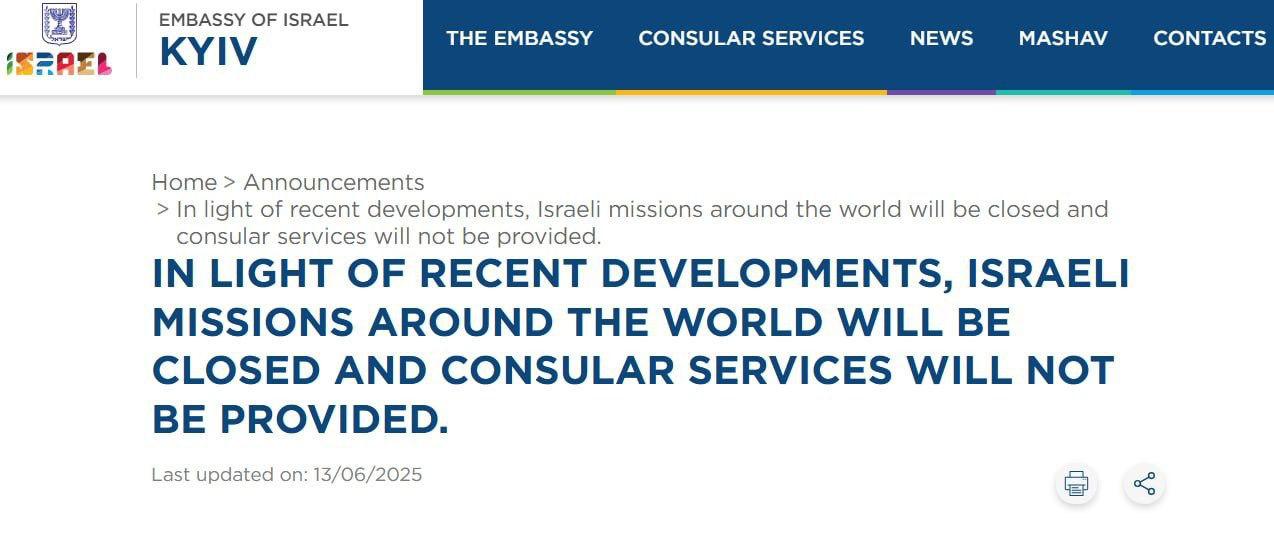 Израильское посольство в Украине сообщило о закрытии всех израильских дипломатических представительств по всему миру.