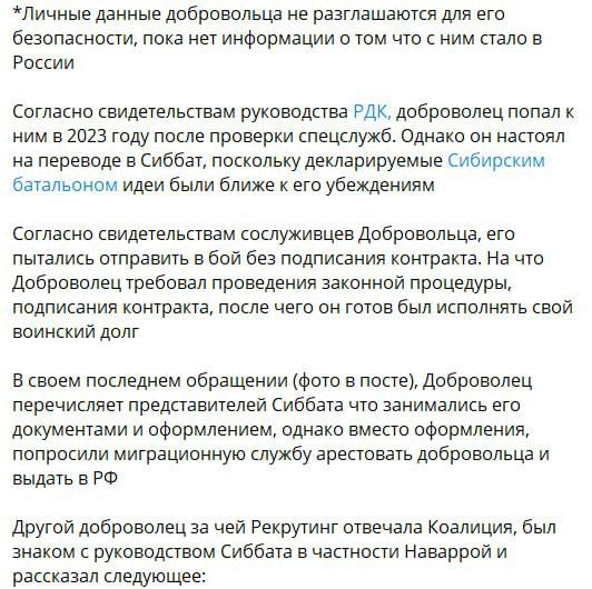 Об этом сообщает Конвент коалиции народов — объединение представителей российских национальных меньшинств, борющихся с режимом РФ, в том числе в составе украинских формирований. Имя бойца не разглашается, известно лишь, что он служил в составе РДК, а затем «Сибирского батальона».