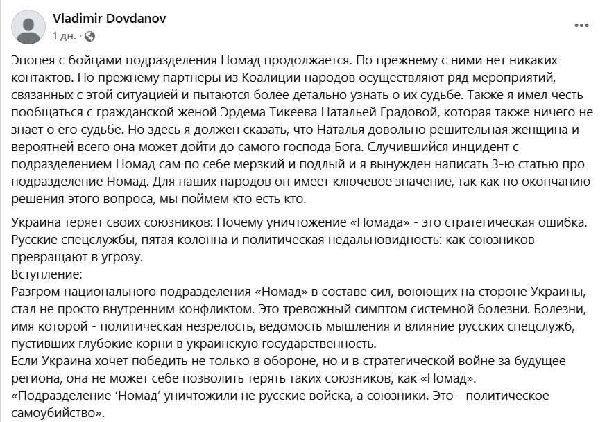 Довданов утверждает, что задержанные бойцы находятся в полной изоляции, к ним не допускают ни родственников, ни правозащитников. По его информации, хотя Легион официально заявляет, что не планирует включать бойцов «Номада» в обмены пленными, на самом деле их готовят к обмену на украинских военнопленных, срок содержания которых уже истёк.