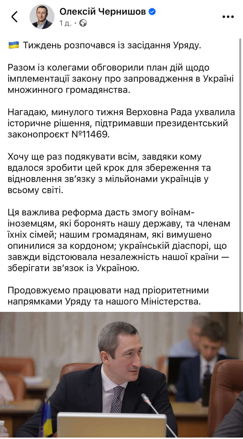 "🇺🇦 Неделя началась с заседания правительства", – пишет Чернышов на странице в Фейсбуке.