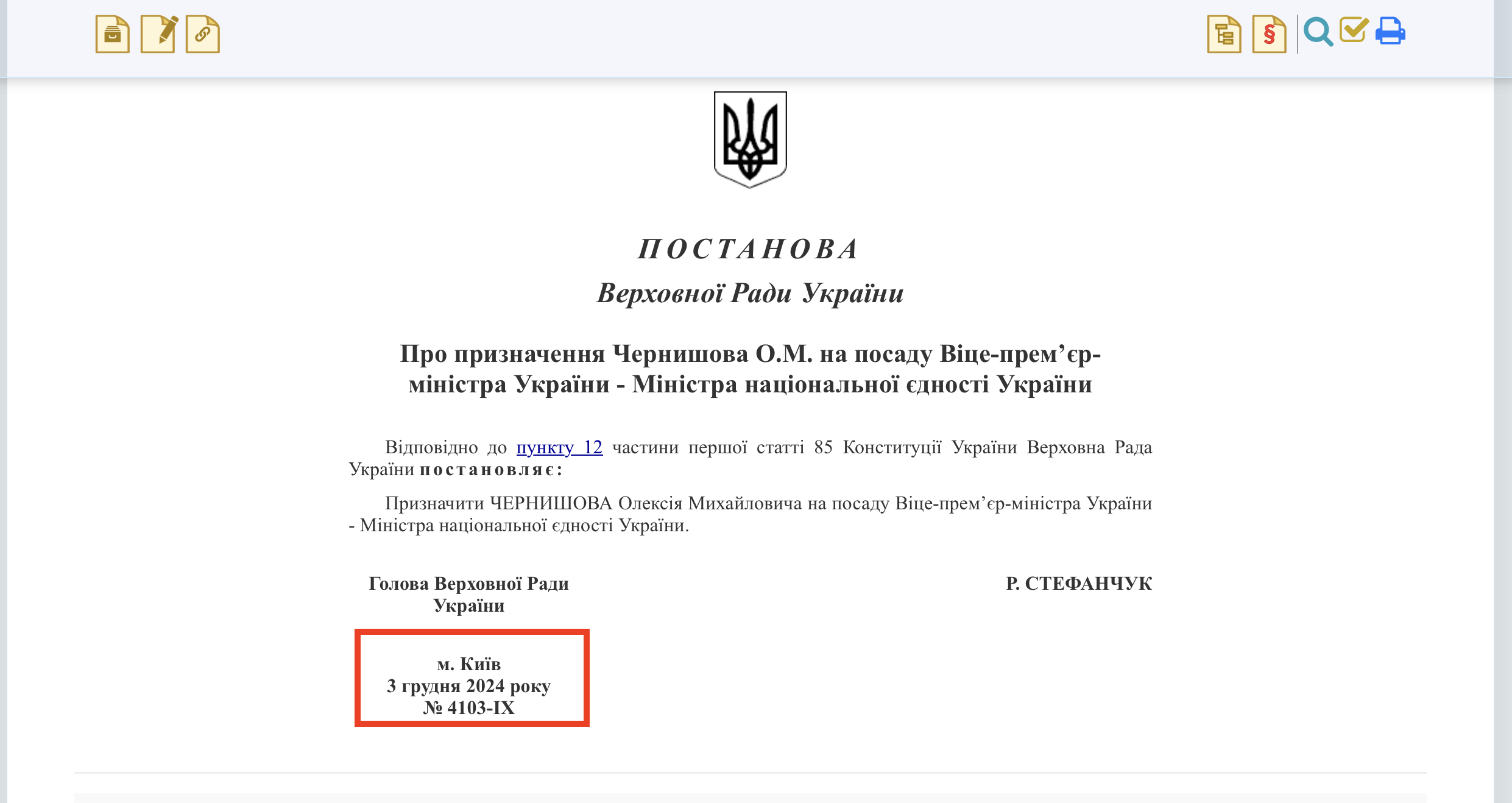 "Постановление Верховной Рады О назначении Чернышова А.М. на должность Вице-премьер-министра Украины – Министра национального единства Украины в соответствии с пунктом 12 части первой статьи 85 Конституции Украины Верховная Рада Украины постановляет: Назначить ЧЕРНЫШОВА Алексея Михайловича на должность Вице-премьер-министра Украины – Министра национального единства Украины. 3 декабря 2024 года".