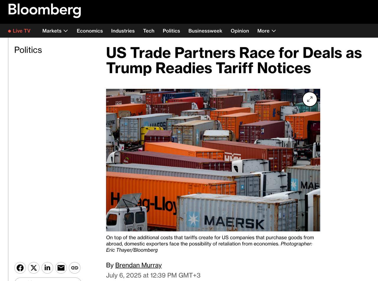 Согласно данным Bloomberg, США намерены объявить о возобновлении тарифов после завершения 90-дневного моратория, который истекает 9 июля.