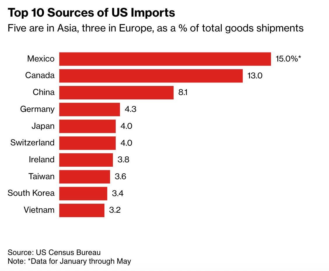 Bloomberg публикует список десяти крупнейших стран-импортеров в США — пять из них расположены в Азии, три — в Европе. Эксперты предупреждают, что возвращение тарифов может увеличить затраты американских компаний и спровоцировать ответные шаги со стороны других стран, в том числе Евросоюза.