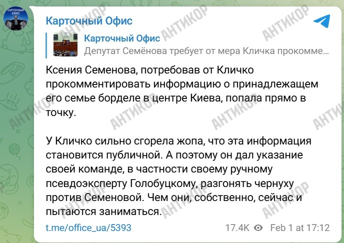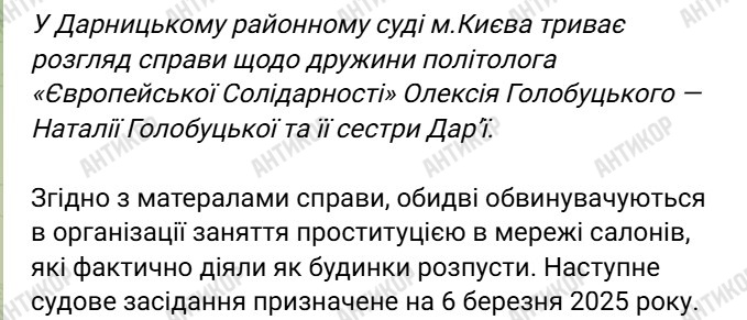 Но в этом контексте невозможно пройти мимо информации все того же ТГ-канала о том, что политтехнолог Виталия Кличко некий Голобуцкий обвиняется в организации и содержании борделей в Киеве, а его жена с сестрой в том, что работали в этих публичных домах проститутками.