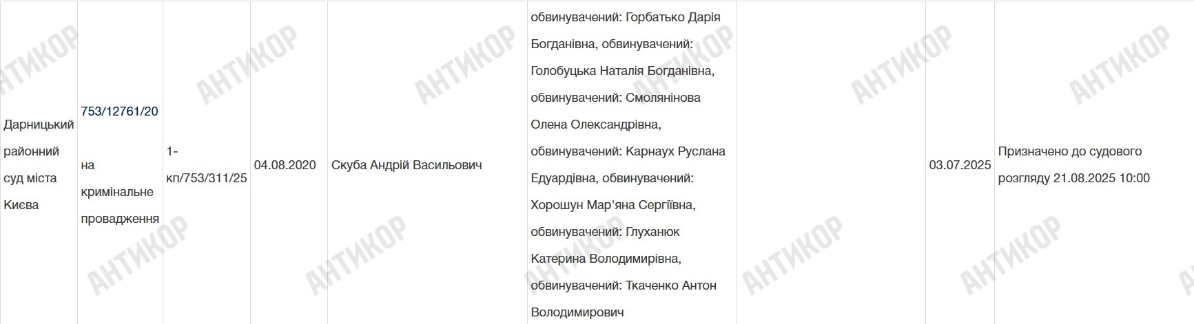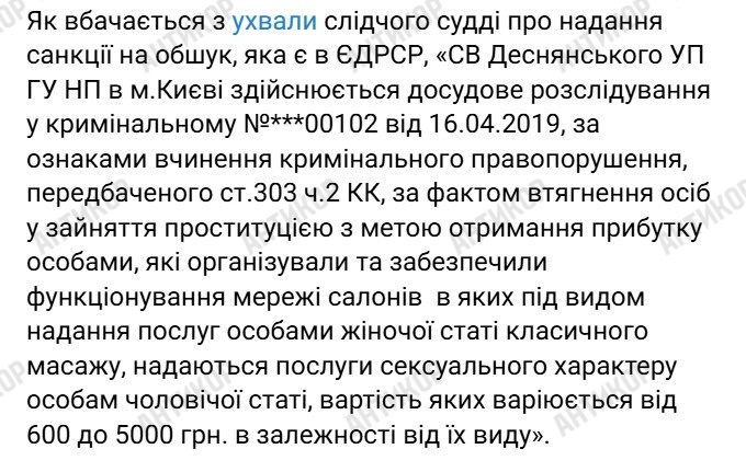 Также авторы поста дают ссылку на Единый государственный реестр судебных дел, из которого следует, что в Деснянском районного суда Киева действительно имеется судебное дело №754/1046/20 по уголовному производству № 42019101030000102 от 16.04.2019 года по статье 303 часть 2 УК «Сутенерство или втягивание в занятие проституцией». Конечно, подозреваемые в данном решении обезличены, поскольку суд продолжается и решения по делу, которое бы набрало законной силы, нет.