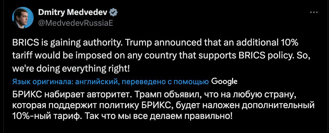 «БРИКС укрепляет свой авторитет. Трамп заявил, что на любую страну, поддерживающую политику БРИКС, будет введен дополнительный 10%-ный тариф. Значит, мы идём в правильном направлении!» - отметил заместитель главы российского Совета безопасности.