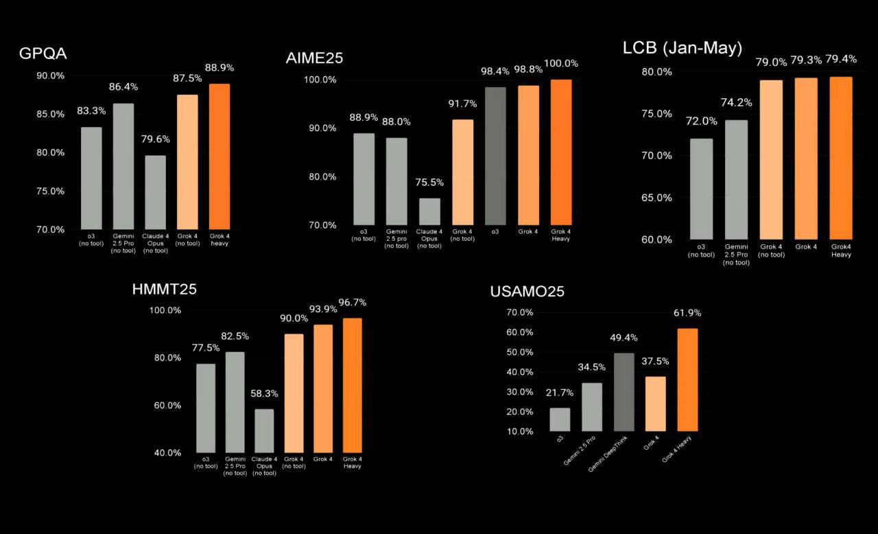 • 100% правильных ответов на тесте по математике — нет задачи, которую Grok 4 не смог бы решить;