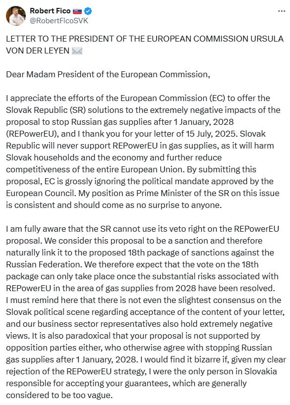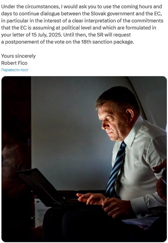«Прошу вас использовать ближайшие часы и дни для продолжения диалога ЕС с правительством Словакии... И пока вопрос не будет решен, Словакия просит отложить голосование по 18-му пакету санкций», – говорится в письме, текст которого Фицо опубликовал в X.