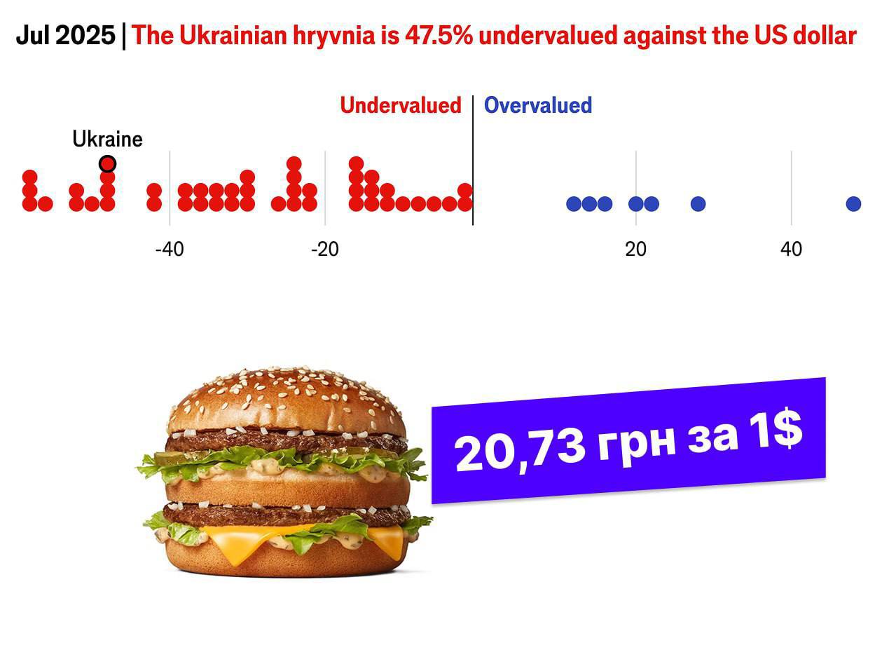 В июле 2025 года Биг-Мак в Украине стоит 132 гривны, тогда как в США — 6,01 доллара. Исходя из этого, курс по паритету покупательной способности (ППС) должен был бы быть 21,96 грн/доллар, тогда как фактический курс в настоящее время составляет 41,81 грн/доллар.