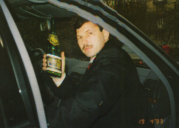 Владимир Кумарин (“Кум”), фото 1993 г. Правая рука еще цела, держит бутылку с “Шампанским”. В июне 1994, когда убили Усвяцова, было покушение и на Кумарина. Он выжил, долго лечился, потерял руку
